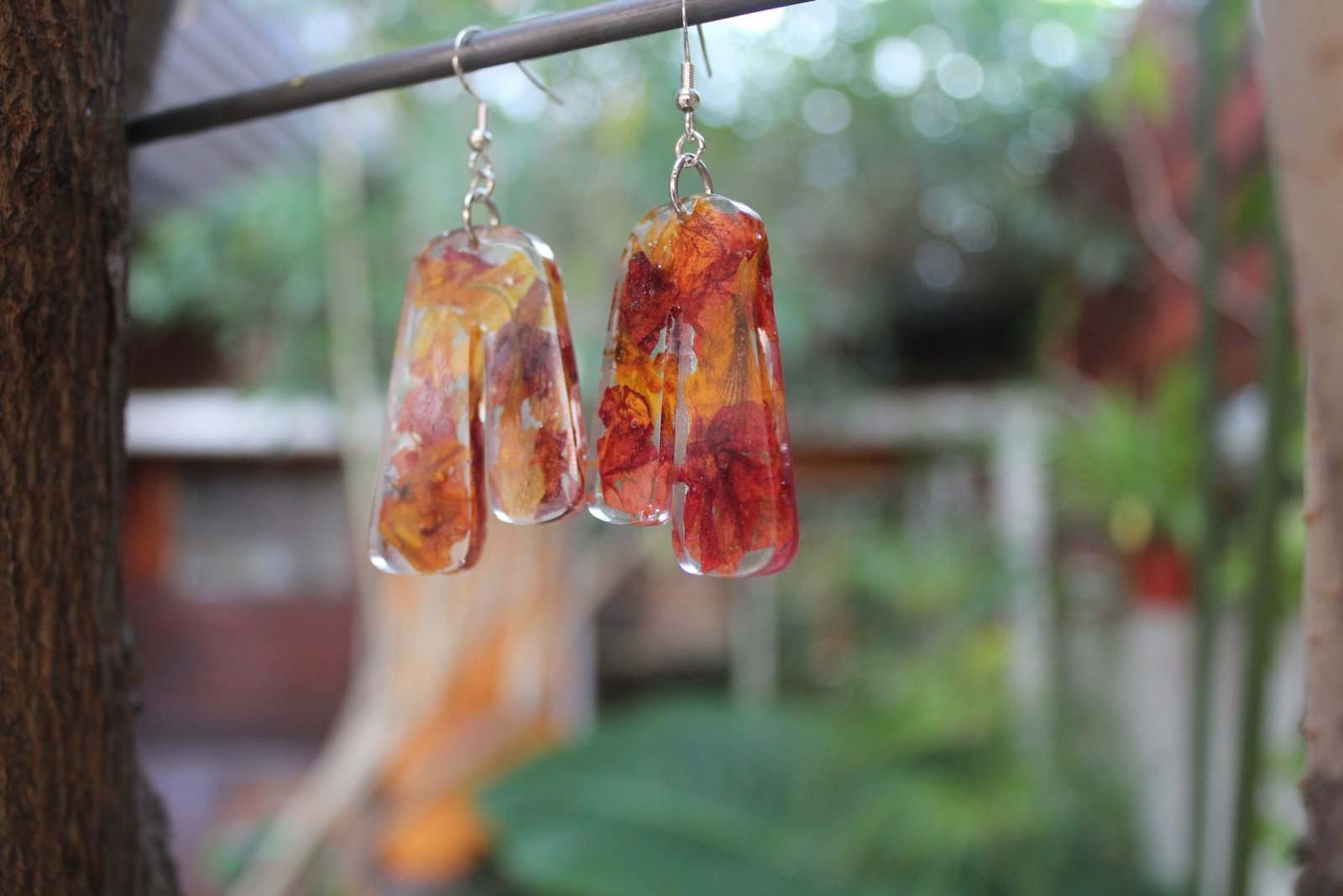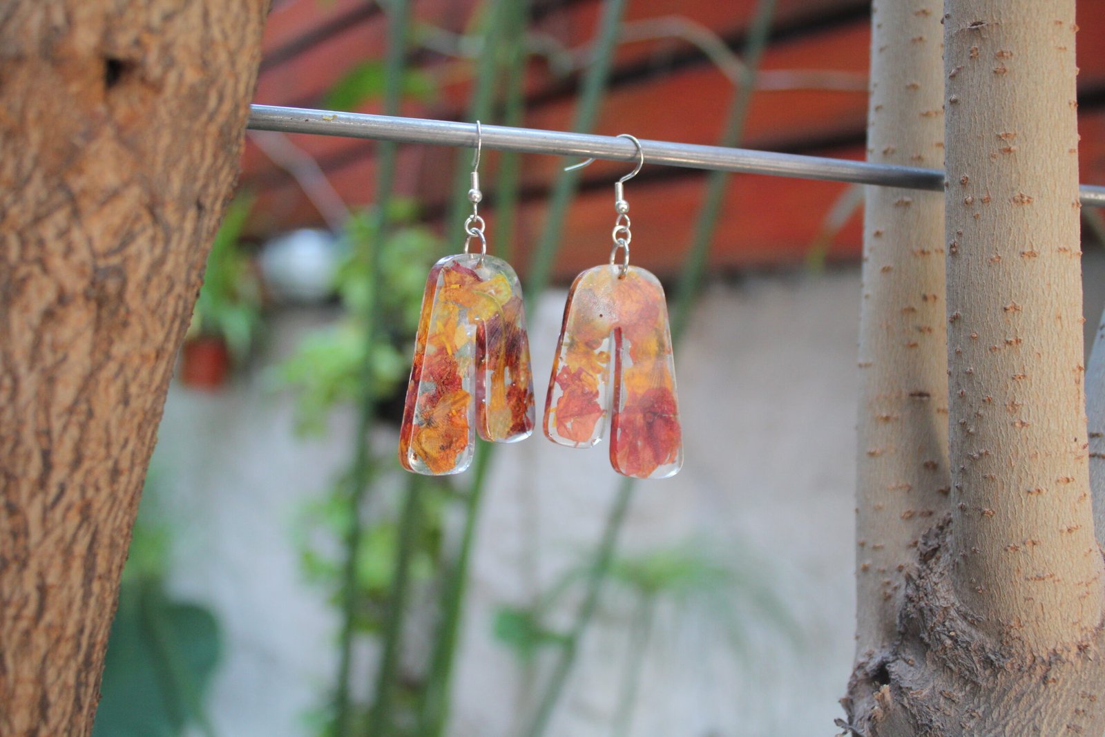 Aretes colgantes en resina, con encapsulado de flores capuchichinas recolectadas en Humedal Cruz de Piedra, Papudo. Gancho en plata 925