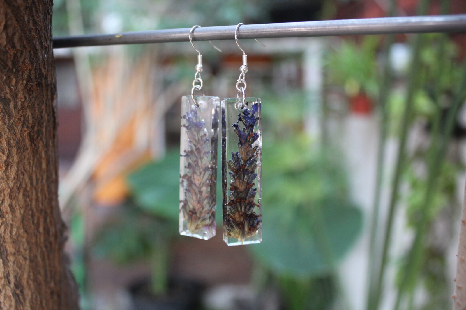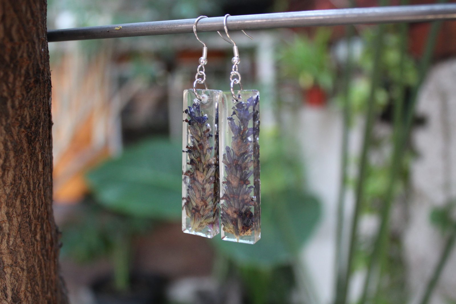 Aretes colgantes en plata 925 y encapsulado de flores naturales de lavanda en resina epóxica