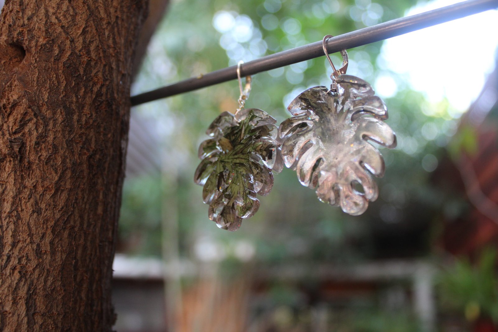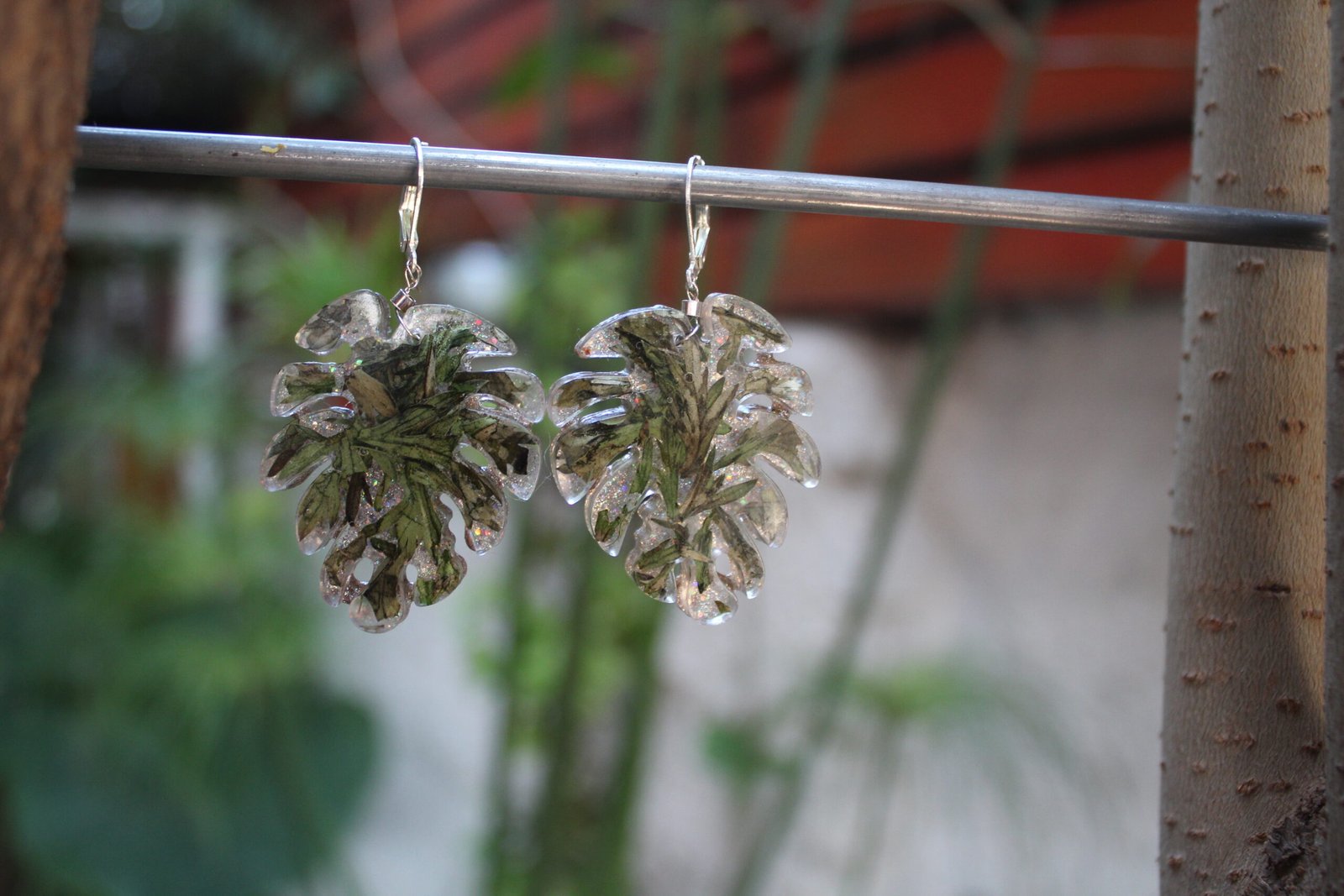Aretes colgantes confeccionados en resina, con encapsulado de hojas silvestres en forma de hoja de monstera. Gancho en plata 925