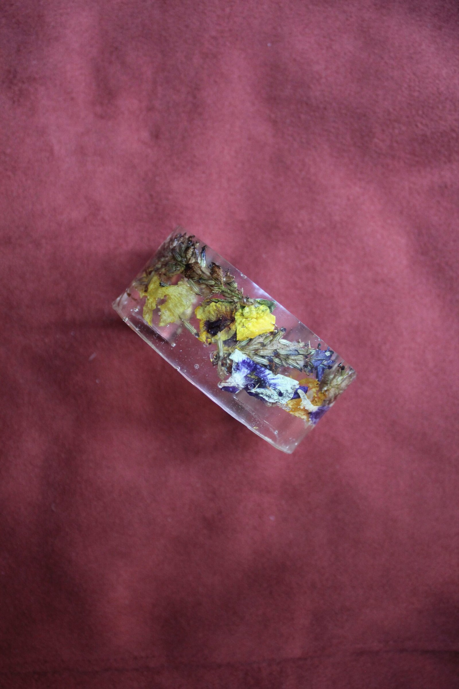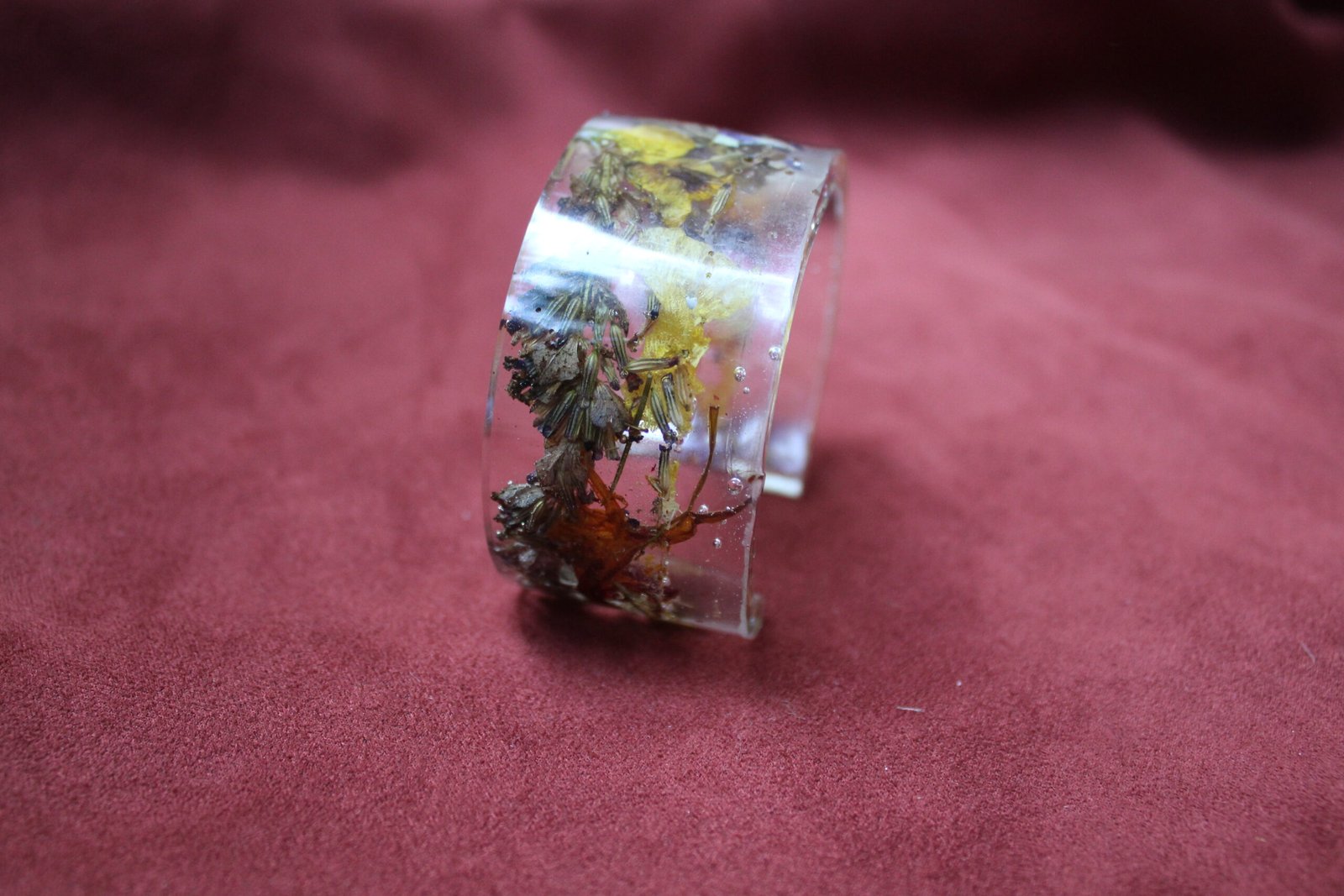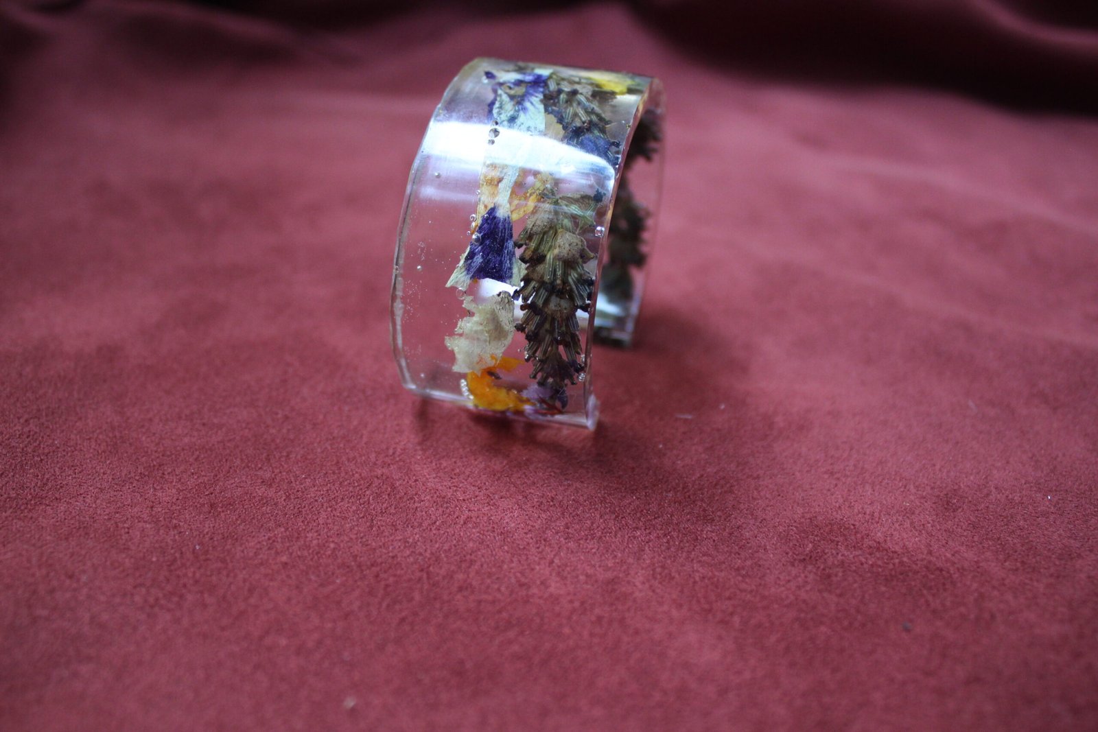 Brazalete en resina epóxica con encapsulado de variedad de flores cultivadas en papudo, quinta región