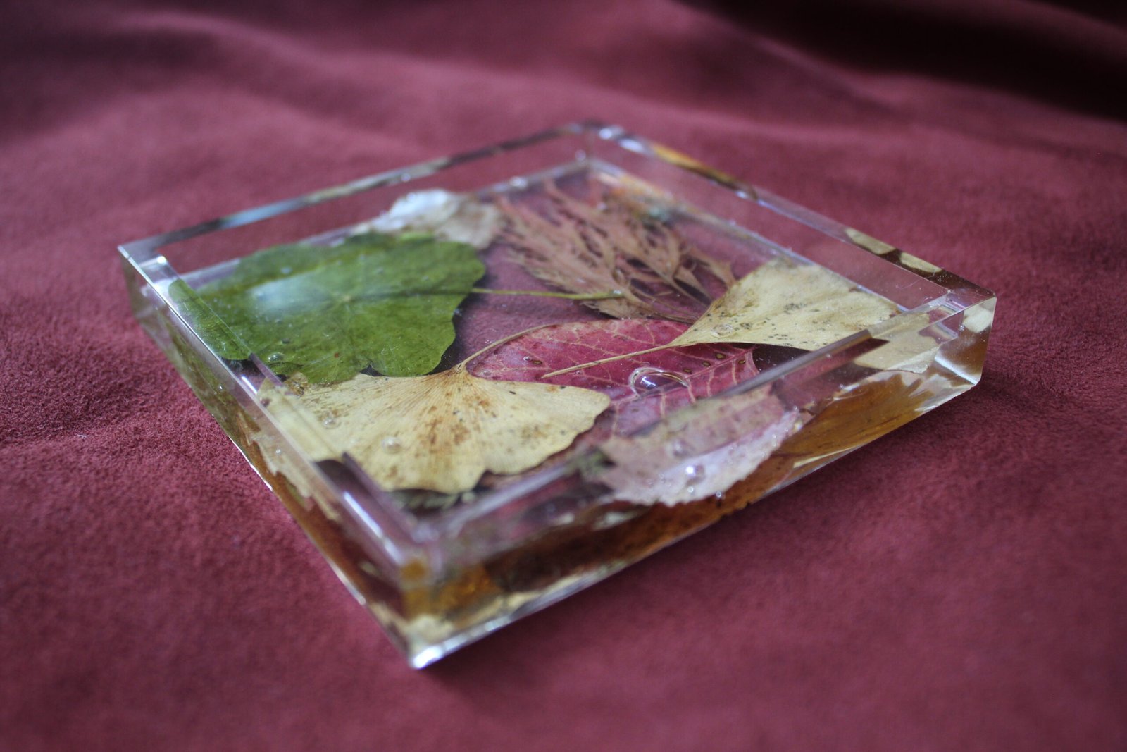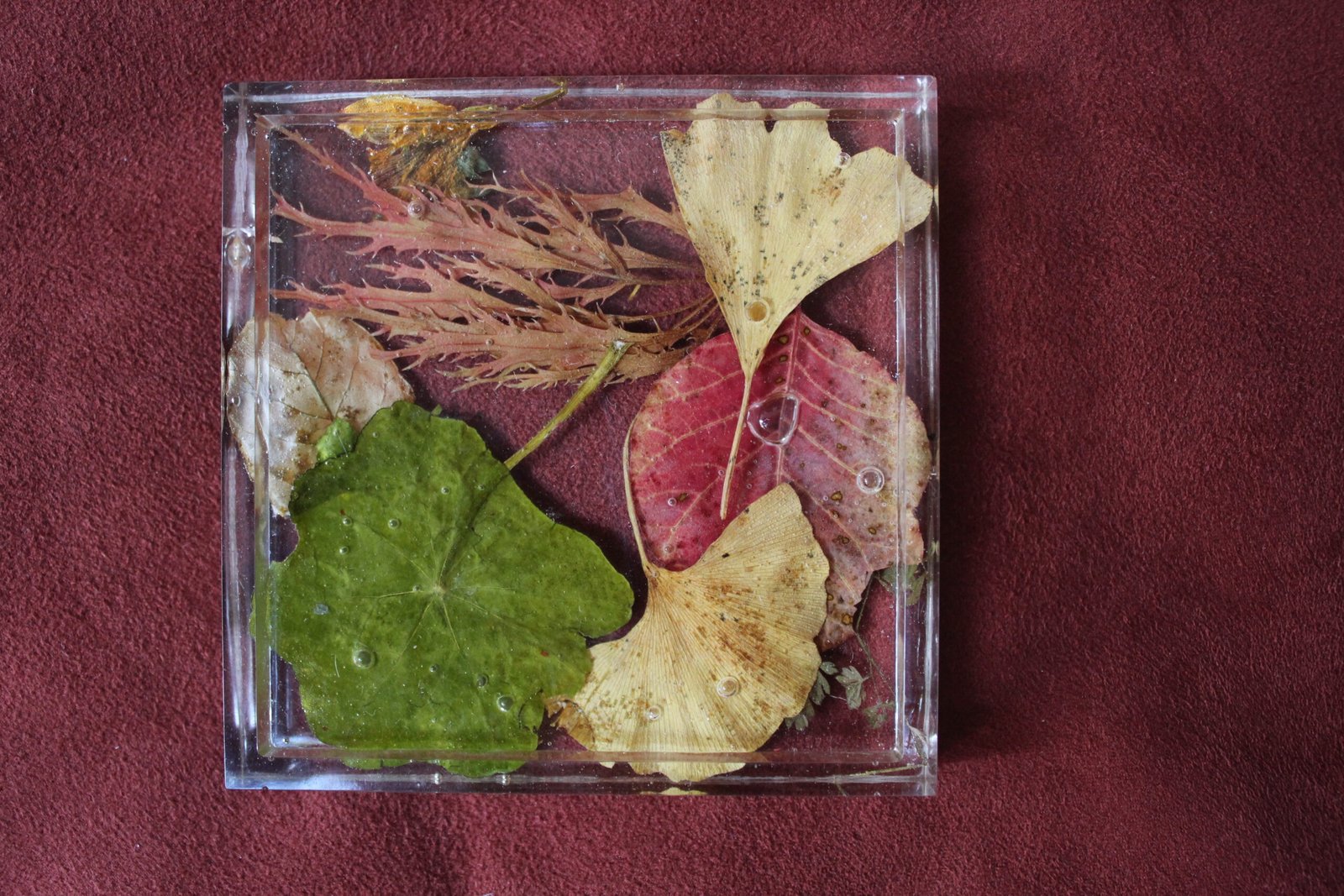 Platillo cuadrado en resina epóxica con encapsulado de hojas naturales en diversos tonos