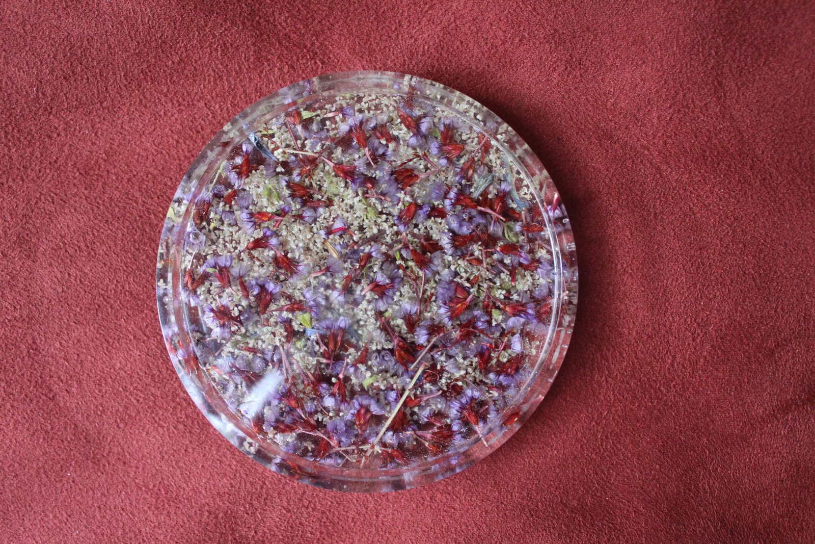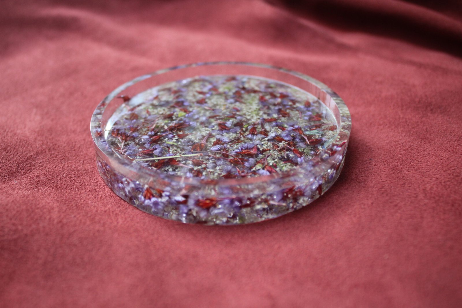 Platillo redondo en resina epóxica con encapsulado de siemprevivas en tonos morados